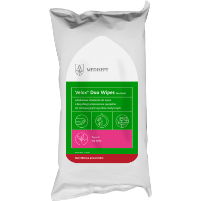 Velox Duo Wipes chusteczki do mycia i szybkiej dezynfekcji małych powierzchni w obszarze medycznym. Zalecane do dezynfekcji małych powierzchni sprzętu medycznego, aparatury medycznej i nieinwazyjnego sprzętu medycznego – jako wyrób medyczny. Zalecane do dezynfekcji końcówek stomatologicznych przed procesem sterylizacji oraz łyżek protetycznych i wycisków silikonowych.