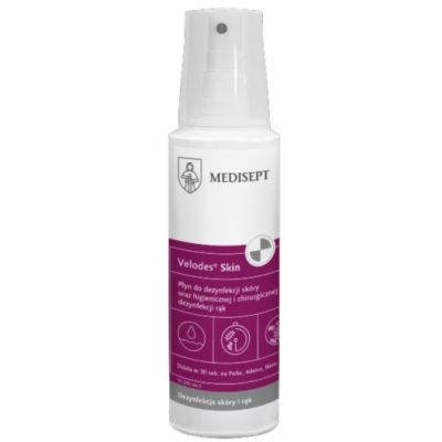 Velodes Skin to płynny, alkoholowy, gotowy do użycia produkt do dezynfekcji skóry oraz higienicznej i chirurgicznej dezynfekcji rąk o działaniu bakteriobójczym, prątkobójczym, grzybobójczym, wirusobójczym (w tym: HBV, HIV, HCV oraz Adeno, Polio, Noro).