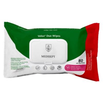 Velox Duo Wipes chusteczki do mycia i szybkiej dezynfekcji małych powierzchni w obszarze medycznym. Zalecane do dezynfekcji małych powierzchni sprzętu medycznego, aparatury medycznej i nieinwazyjnego sprzętu medycznego – jako wyrób medyczny. Zalecane do dezynfekcji końcówek stomatologicznych przed procesem sterylizacji oraz łyżek protetycznych i wycisków silikonowych.