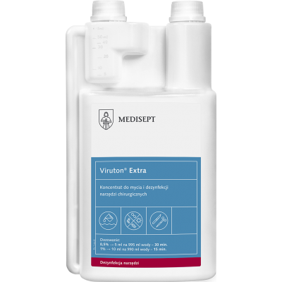 Viruton Extra to wydajny koncentrat przeznaczony do jednoczesnego mycia i dezynfekcji instrumentów chirurgicznych i rotacyjnych. Dzięki zawartości enzymu posiada bardzo dobre właściwości czyszczące i szerokie spektrum bójcze w krótkim czasie działania. Przeznaczony jest do dezynfekcji manualnej oraz w myjkach ultradźwiękowych. Produkt wykazuje właściwości antykorozyjne i wysoką tolerancję materiałową. Jest zalecany do instrumentów ze stali szlachetnej, niklu, miedzi, aluminium, gumy, porcelany, szkła i tworzywa sztucznego.