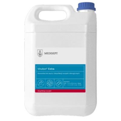 Viruton Extra to wydajny koncentrat przeznaczony do jednoczesnego mycia i dezynfekcji instrumentów chirurgicznych i rotacyjnych. Dzięki zawartości enzymu posiada bardzo dobre właściwości czyszczące i szerokie spektrum bójcze w krótkim czasie działania. Przeznaczony jest do dezynfekcji manualnej oraz w myjkach ultradźwiękowych. Produkt wykazuje właściwości antykorozyjne i wysoką tolerancję materiałową. Jest zalecany do instrumentów ze stali szlachetnej, niklu, miedzi, aluminium, gumy, porcelany, szkła i tworzywa sztucznego.